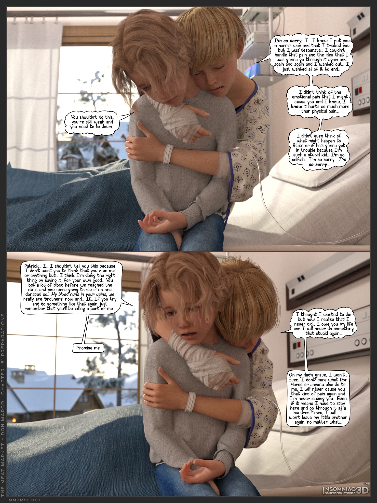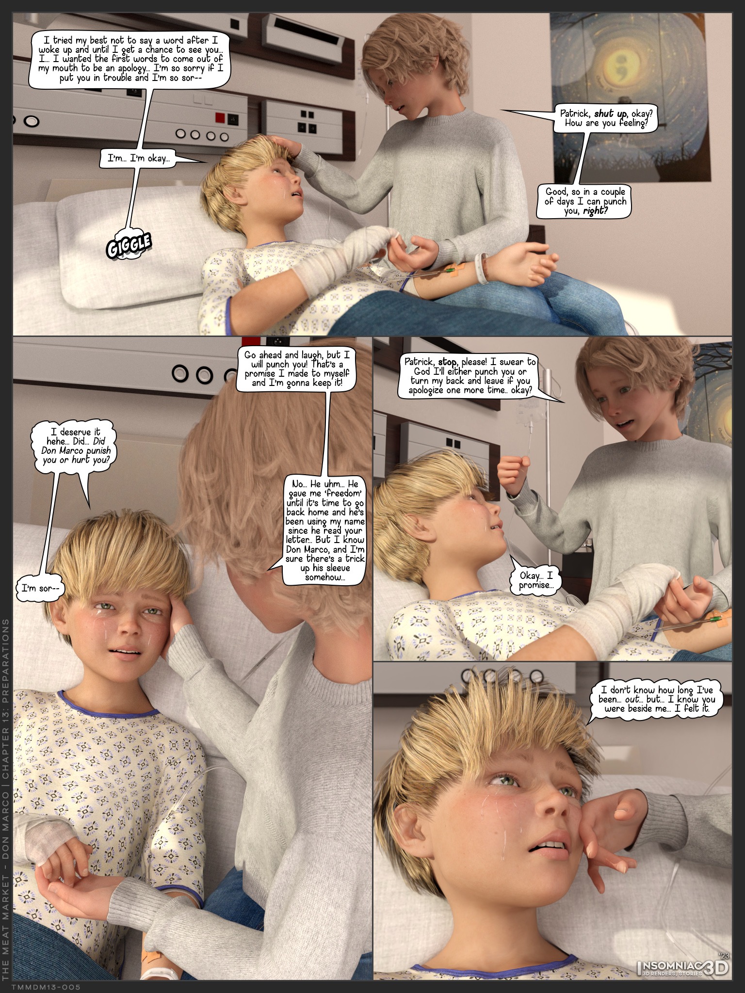 The long-awaited continuation of the newest 3D yaoi shota comic serie from famous Insomniac! The Meat Market revolves around several characters who, willingly or not, are part of Don Marco’s ’empire’. In this chapter: While Patrick is in a coma, events are unfolding behind closed doors. Rick is convinced that his ticket is drawn, James seems to have something in his mind, or up his sleeve. Don Marco has scores to settle, Mr. B is there to help… Who is Mr. B? Will Patrick recover? What’s the deal with James & Shawn? Was James honest or was he playing a game on the boy? Did Shawn betray the seemingly nice man or chose to remain loyal? Who are “Laurel & Hardy”?