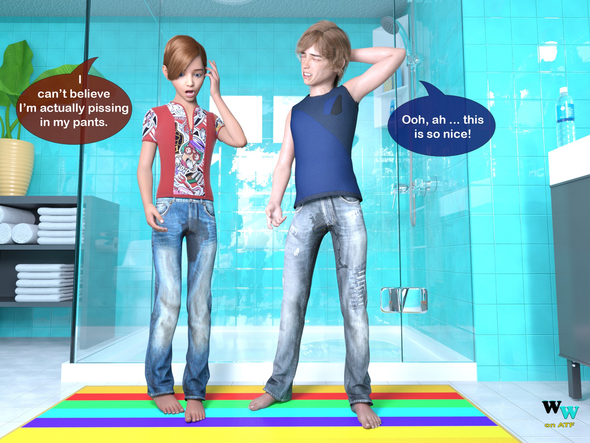 These two cute little boys are very naughty because they love pissing games and they also really enjoy wearing diapers and having fun in them! 😉 Warnings: golden shower (in some scenes).